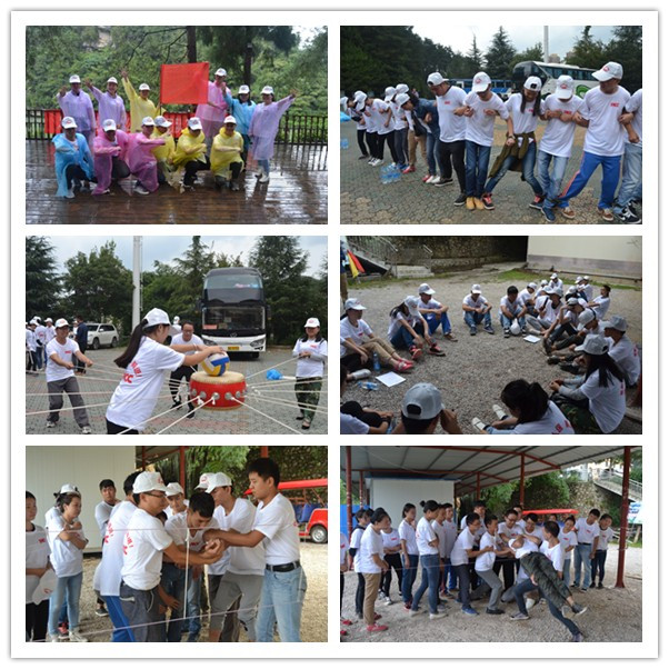 9月10日某保险公司贵州分公司续保团队参加了我公司2016年秋季拓展培训。尽管天空下起了很大的雨,学员们只得穿上雨衣来完成一天的团队项目挑战,但恶劣的天气丝毫没有影响团队的士气。精彩的团队展示环节,体现出每一支小团队不一样的精神面貌。一个人的力量是微小的,但是一个团队的力量却可以非常强大。在这里,没有完美的个人,但有完美的团队。只要大家一起齐心协力,就一定可以打败我们的对手。