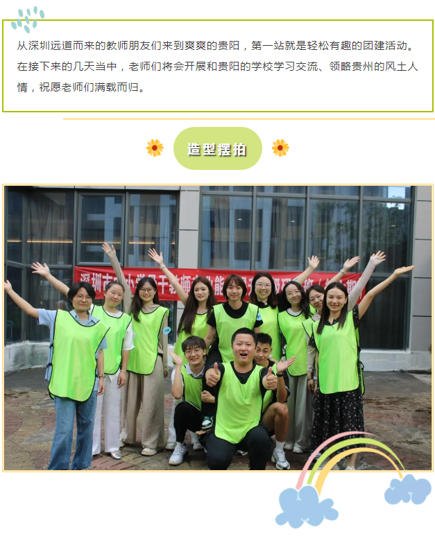 从深圳远道而来的教师朋友们来到爽爽的贵阳,第一站就是轻松有趣的团建活动。在接下来的几天当中,老师们将会开展和贵阳的学校学习交流、领略贵州的风土人情,祝愿老师们满载而归。