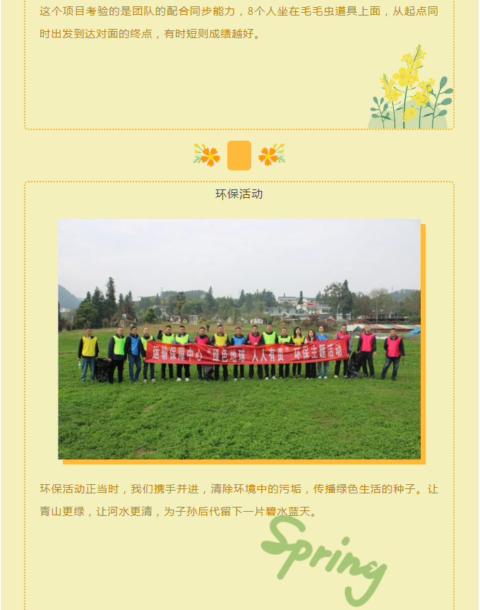 在教练的组织下伙伴们开展了疯狂毛毛虫、射箭游戏、环保活动等活动。过程中把大家分成了小组进行PK。活动中挑战、挑战中PK、PK中欢乐、欢乐中共赢。